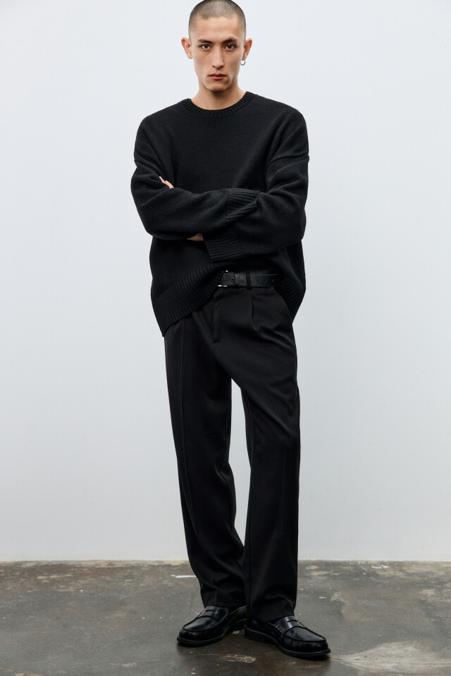 - С рубашкой и пиджаком. Самое классическое сочетание с множеством возможностей: выбирай белоснежную рубашку, черный костюм и туфли для яркого, торжественного аутфита. Хочешь выглядеть более расслабленно, но оставаться в рамках делового дресс-кода? Присмотрись к брюкам темного, но не черного цвета, дополни их пиджаком в тон, а рубашку выбери не белую, а молочную или голубую;