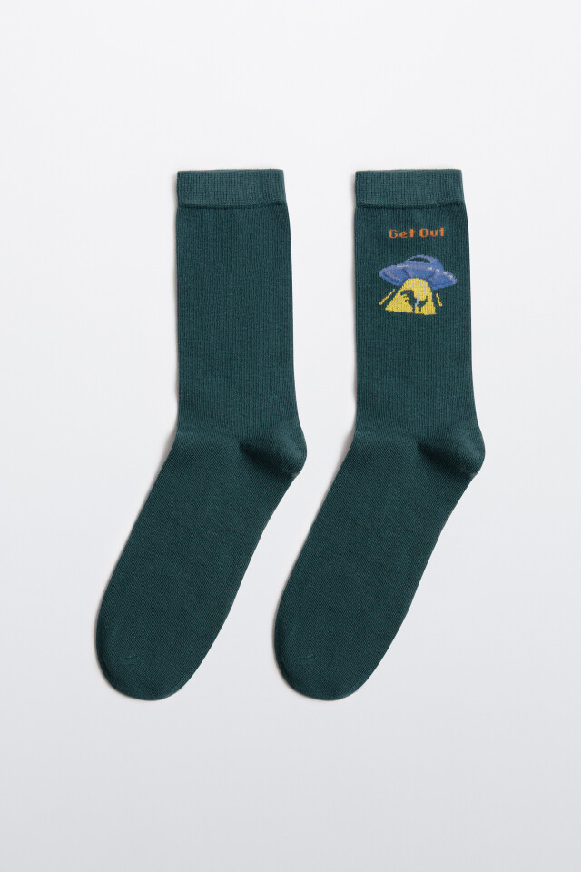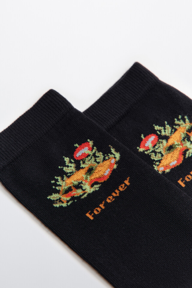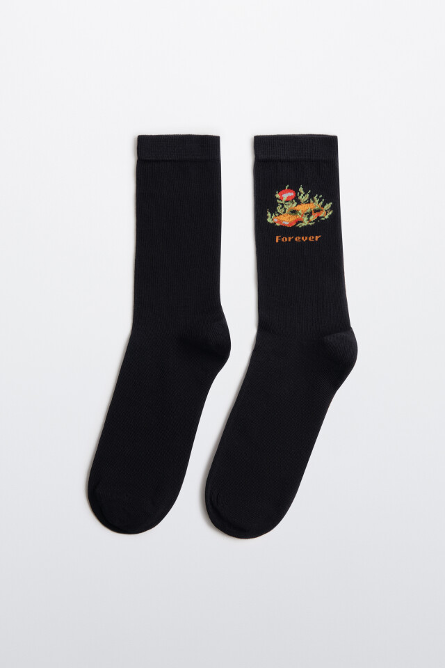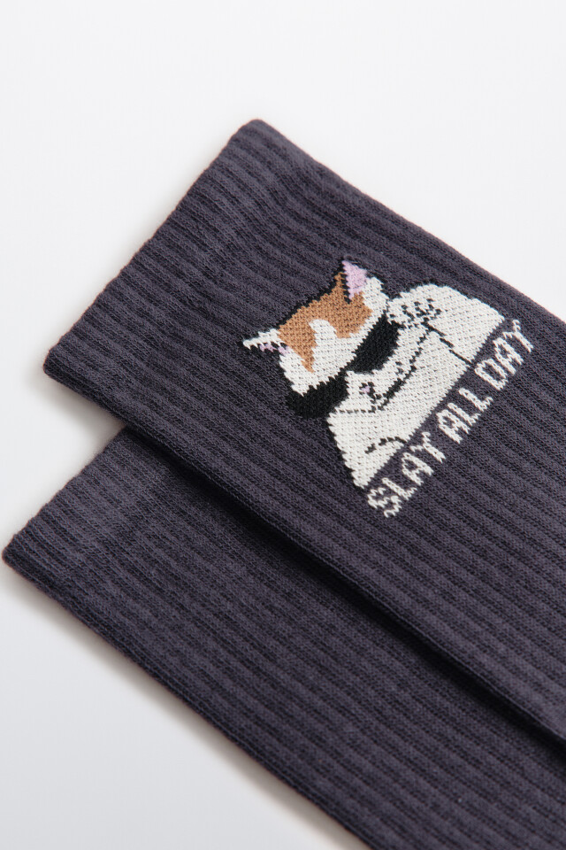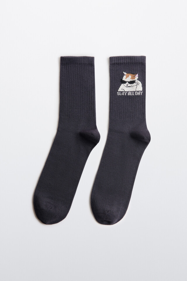 Ассортимент принтов поражает разнообразием. Например, носки с рисунками — это настоящий простор для фантазии. От забавных изображений еды до животных «с характером» — такая вещь становится лаконичным, но при этом ярким акцентом образа. Например, носки с бургером или пиццей идеально подойдут для неформальной встречи с друзьями, а модели с котиками и смешными надписями отлично передадут настроение на учебе или работе.