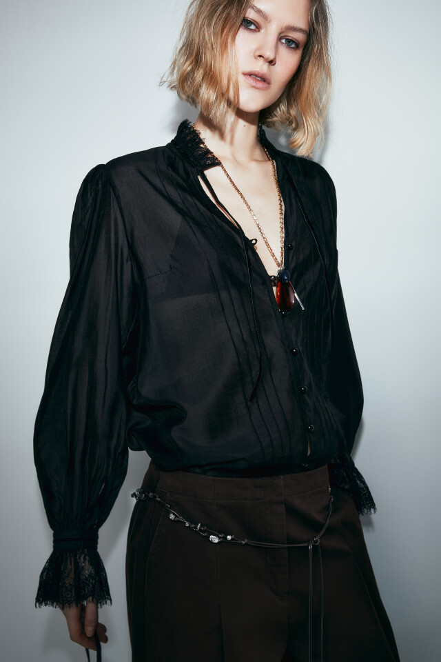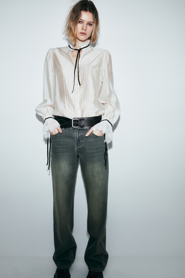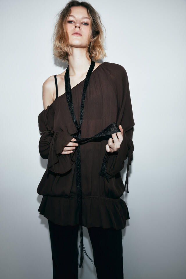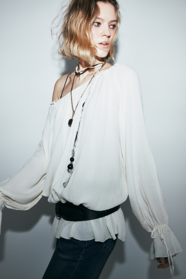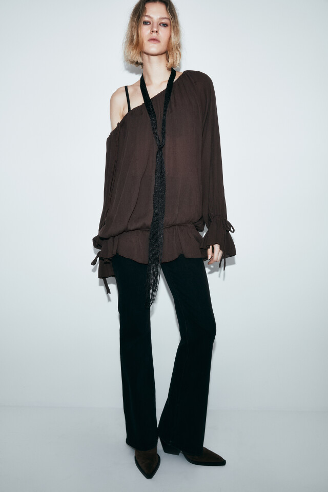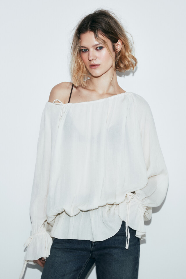 • Блузы с открытыми плечами, воланами, драпировкой или бантом – добавят романтичности, подчеркнут женственность;