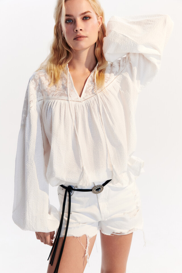 • Настроение «бохо»: блузка с оборками, классические синие шорты, казаки из коричневой или рыжей замши, расслабленная сумка на плечо, акцентные серьги и несколько браслетов в тон;