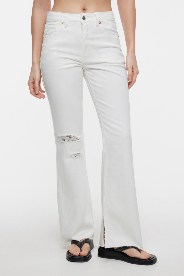Джинсы flare с открытыми срезами и рваным коленом