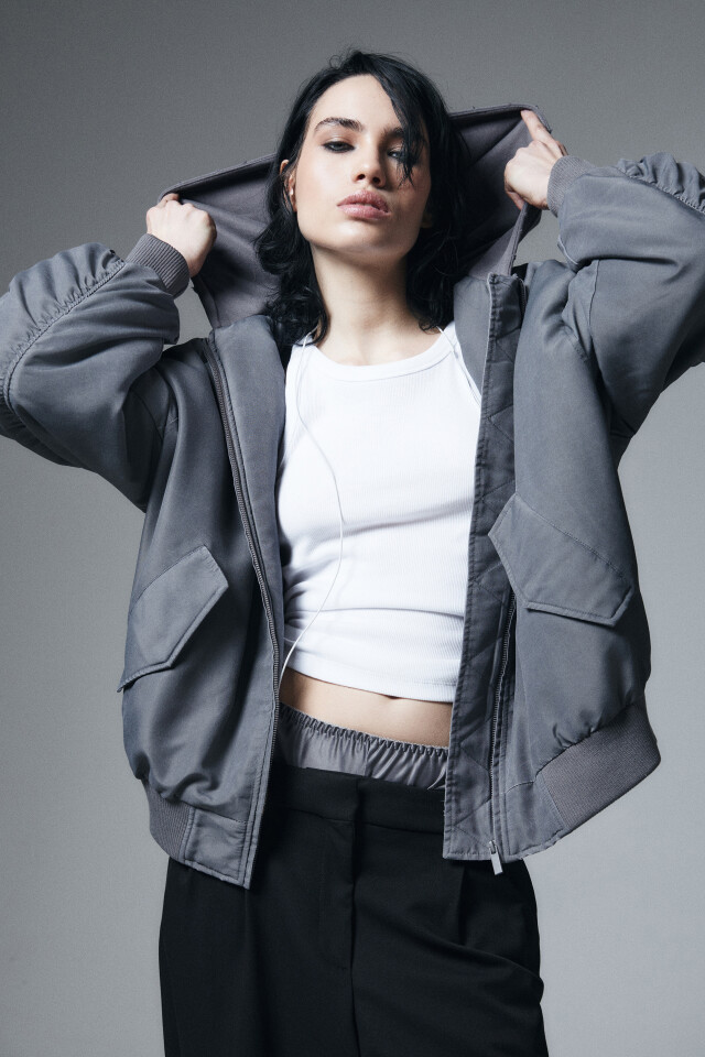 Куртка-бомбер оверсайз с капюшоном и принтом