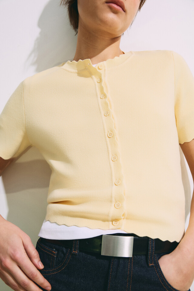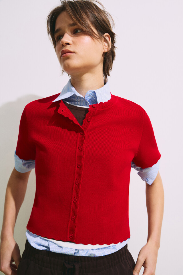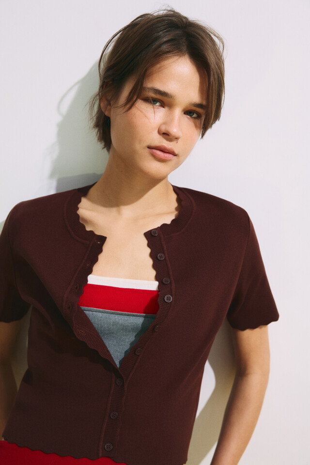 Кардиганы на пуговицах с посадкой по фигуре — это стильный самостоятельный верх в повседневном или официальном стиле. Дополнительный декор (например, в виде бусин или бахромы) делает кардиган акцентным элементом образа: в таком виде ты точно не останешься незамеченной. Модели этого фасона хорошо смотрятся с любыми джинсами: высокая посадка позволит создать сдержанный, аккуратный вид, а низкая — подчеркнет линию талии. Облегающий кардиган хорошо выглядит и с юбками, в том числе костюмными или кожаными.