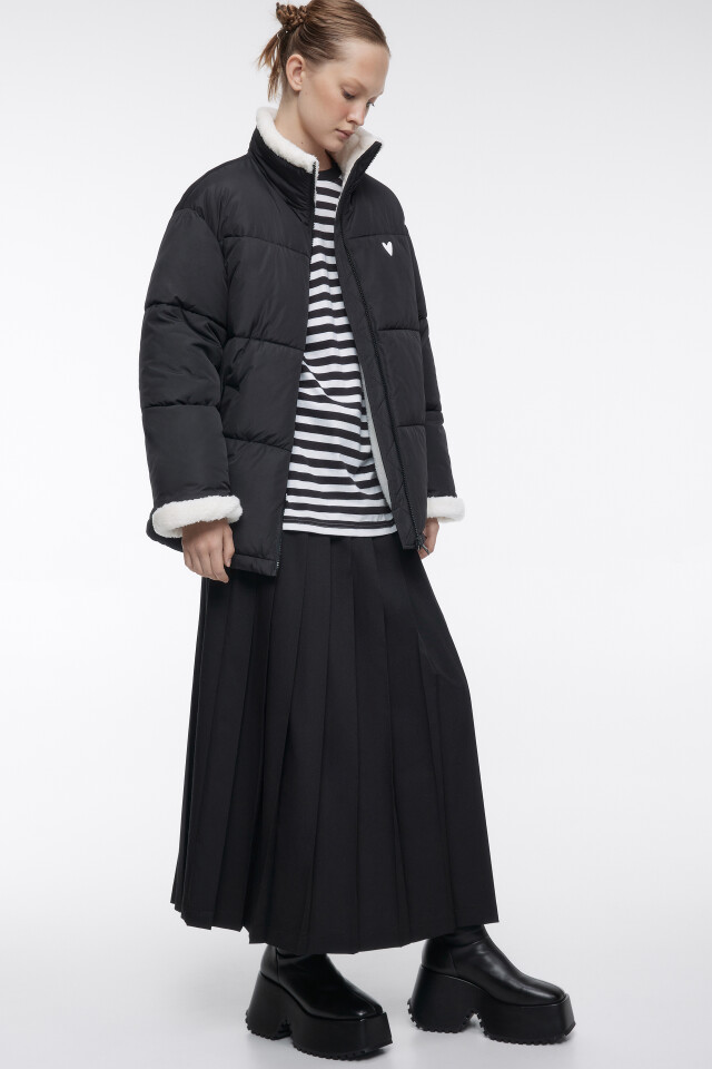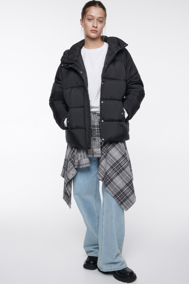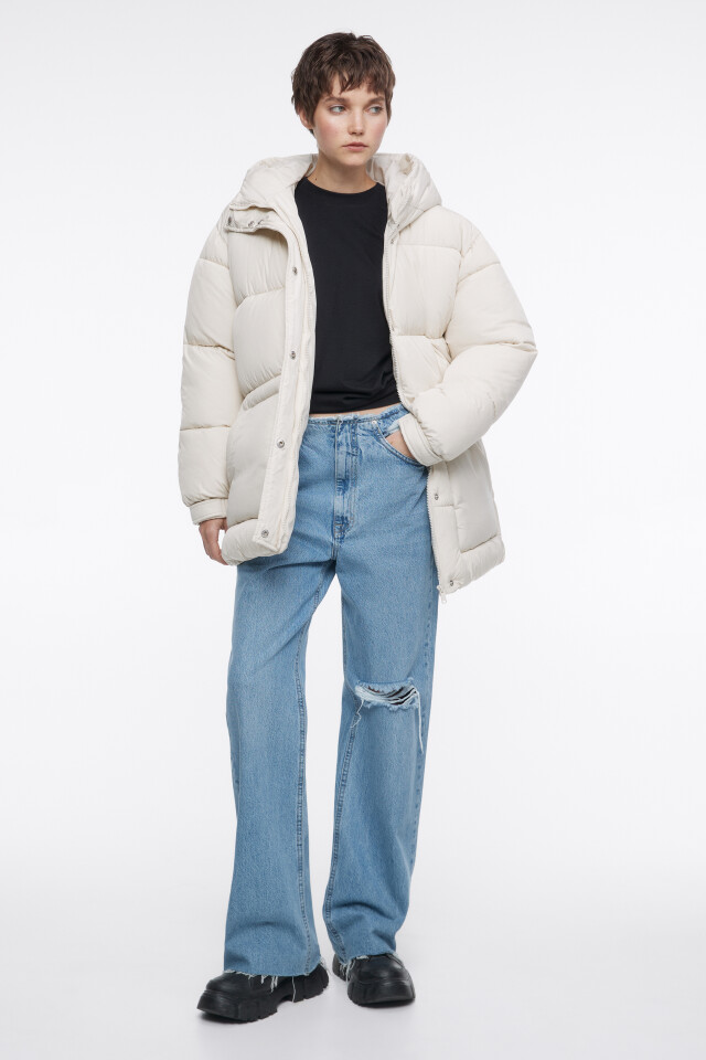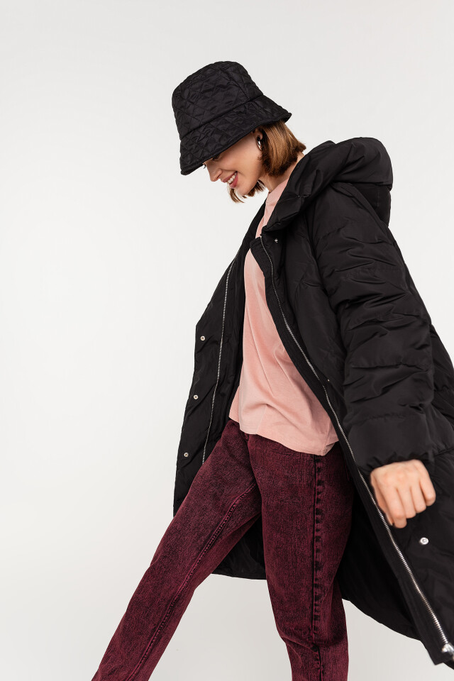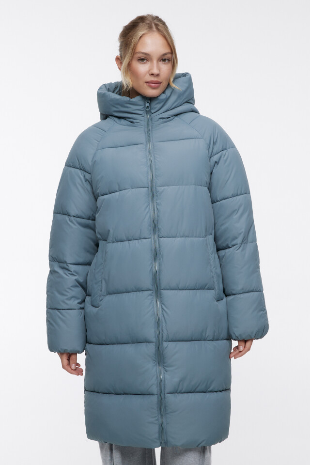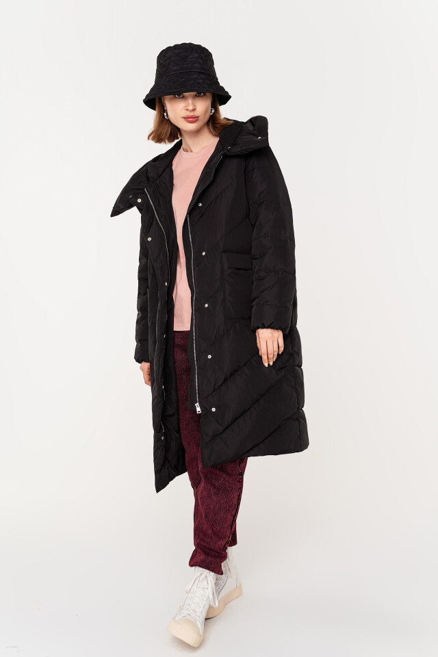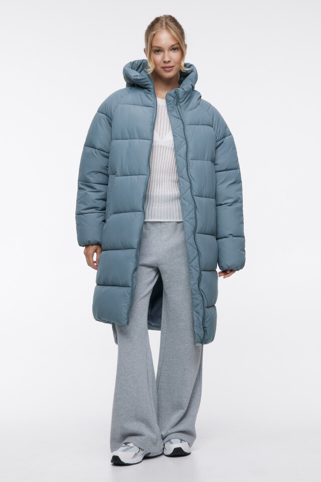 Пальто oversize стеганое длинное с капюшоном