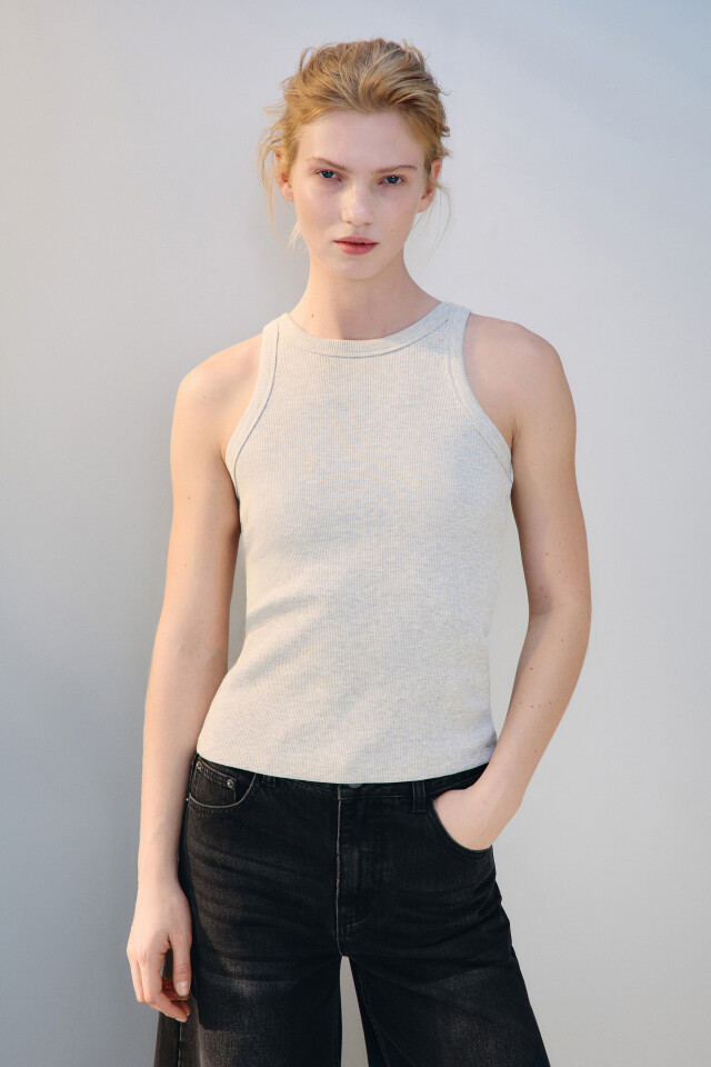 Еще один популярный крой — майки в рубчик. Они красиво облегают фигуру, а за счет необычной фактуры выглядят самодостаточно. Такие модели можно использовать и как нижний слой (например, под бомбер), и как самостоятельный верх — в обоих случаях ты будешь выглядеть стильно. Укороченные майки в рубчик — это отличный выбор для занятий спортом: они не стесняют движения и хорошо тянутся за счет эластичной ткани.