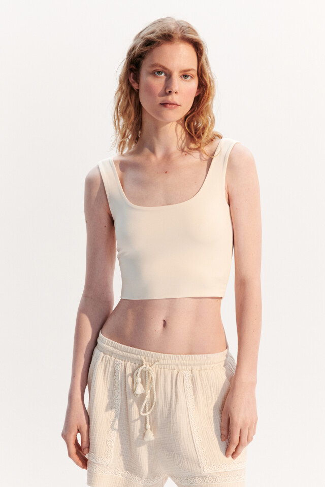 Еще один популярный крой — майки в рубчик. Они красиво облегают фигуру, а за счет необычной фактуры выглядят самодостаточно. Такие модели можно использовать и как нижний слой (например, под бомбер), и как самостоятельный верх — в обоих случаях ты будешь выглядеть стильно. Укороченные майки в рубчик — это отличный выбор для занятий спортом: они не стесняют движения и хорошо тянутся за счет эластичной ткани.