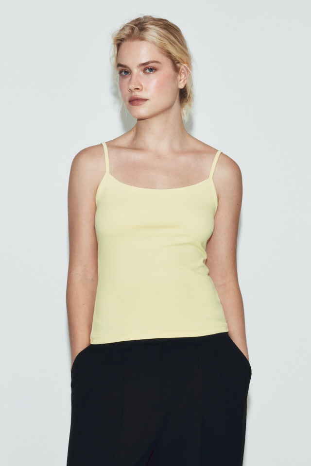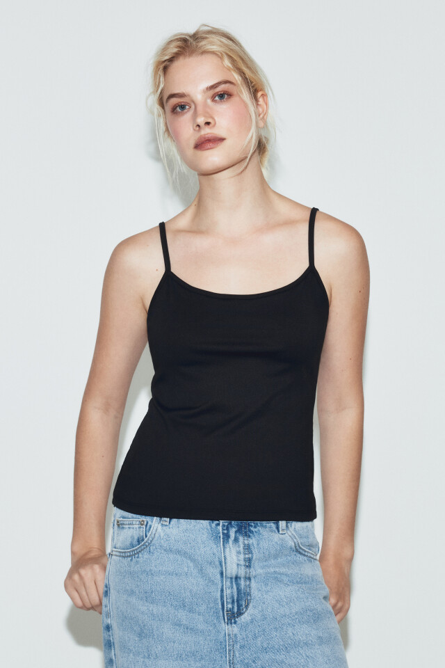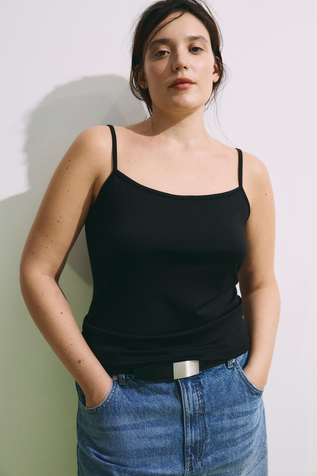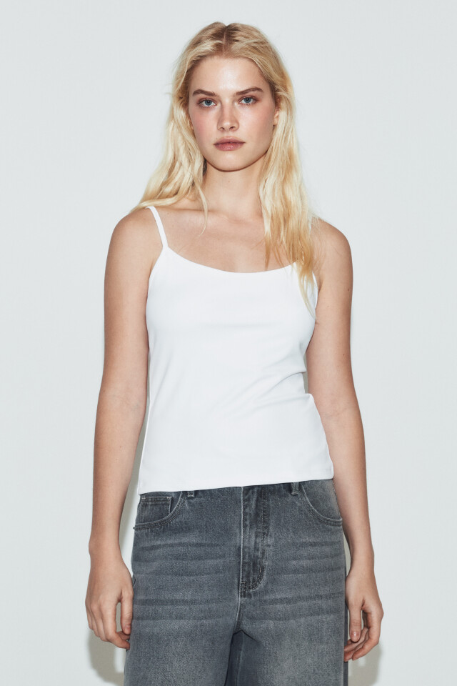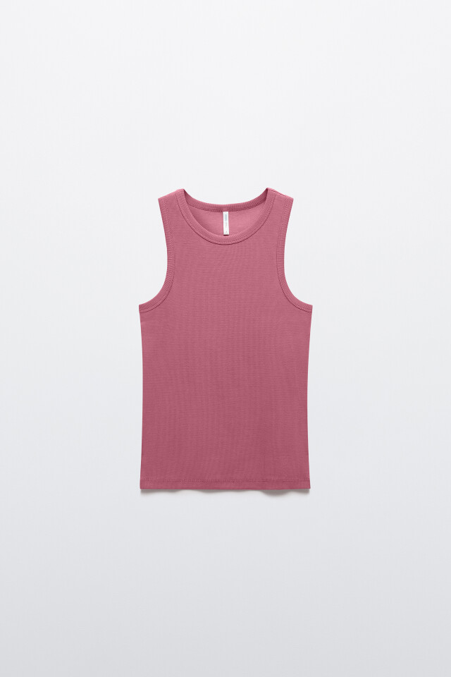 Еще один популярный крой — майки в рубчик. Они красиво облегают фигуру, а за счет необычной фактуры выглядят самодостаточно. Такие модели можно использовать и как нижний слой (например, под бомбер), и как самостоятельный верх — в обоих случаях ты будешь выглядеть стильно. Укороченные майки в рубчик — это отличный выбор для занятий спортом: они не стесняют движения и хорошо тянутся за счет эластичной ткани.