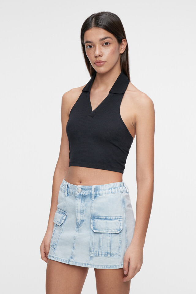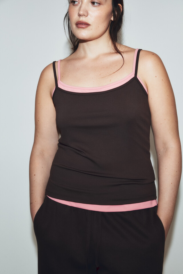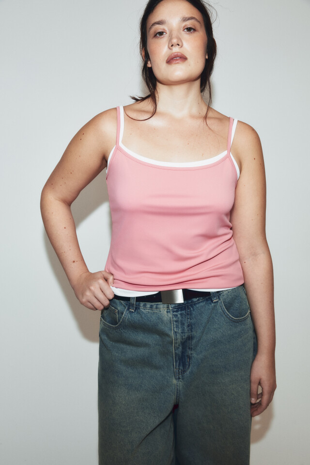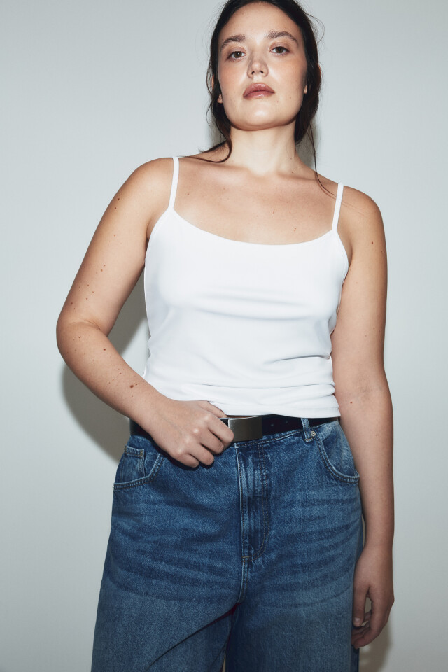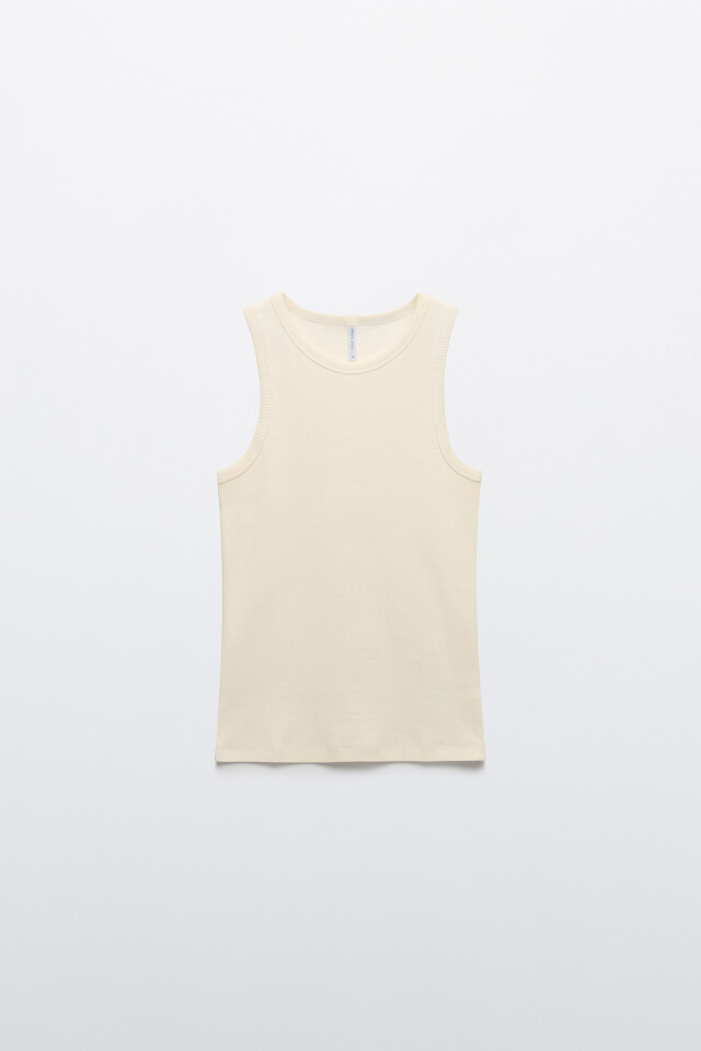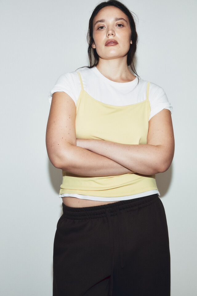 Еще один популярный крой — майки в рубчик. Они красиво облегают фигуру, а за счет необычной фактуры выглядят самодостаточно. Такие модели можно использовать и как нижний слой (например, под бомбер), и как самостоятельный верх — в обоих случаях ты будешь выглядеть стильно. Укороченные майки в рубчик — это отличный выбор для занятий спортом: они не стесняют движения и хорошо тянутся за счет эластичной ткани.