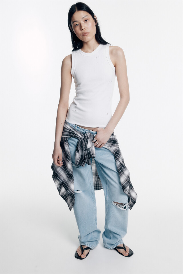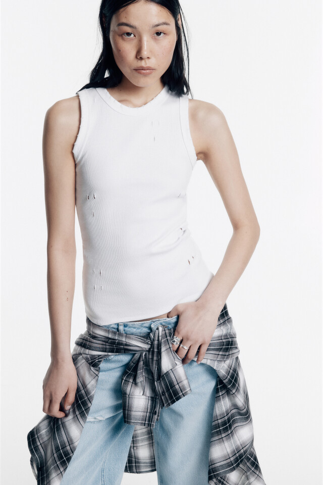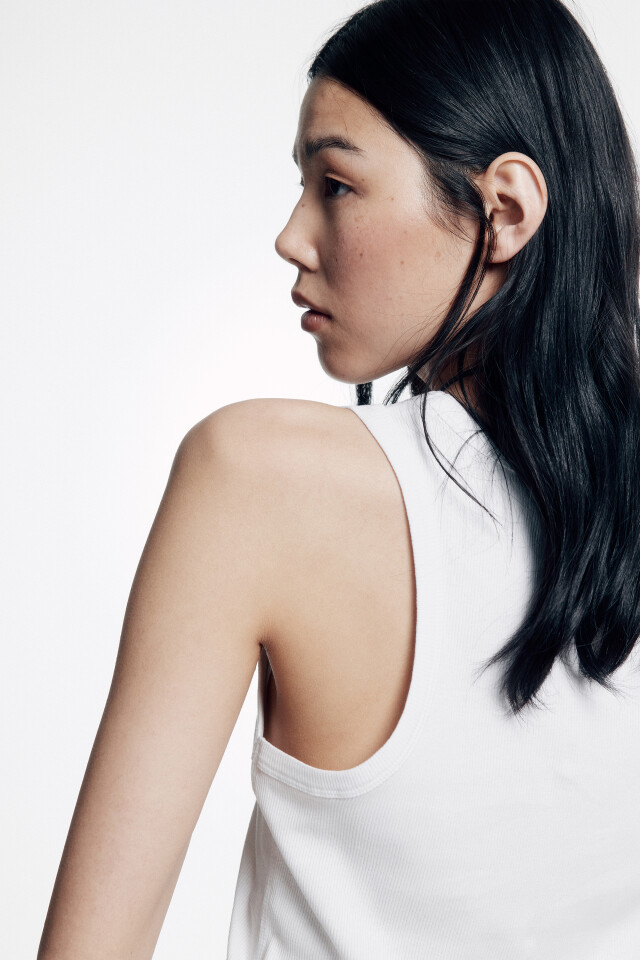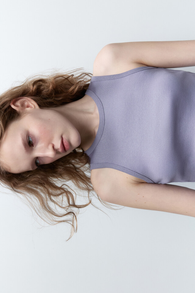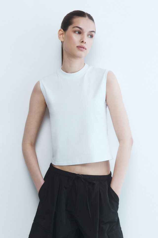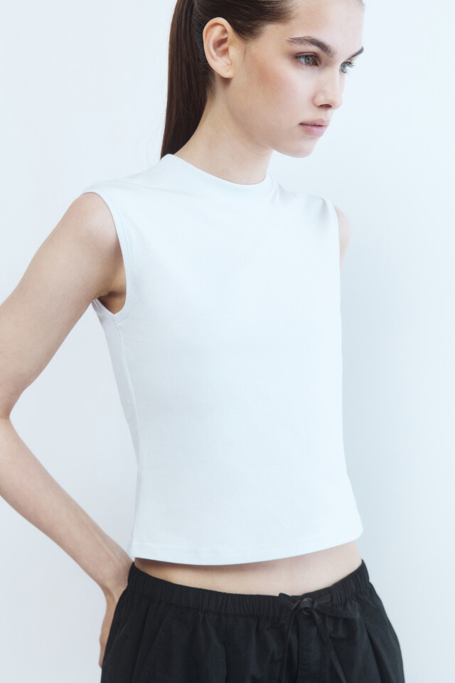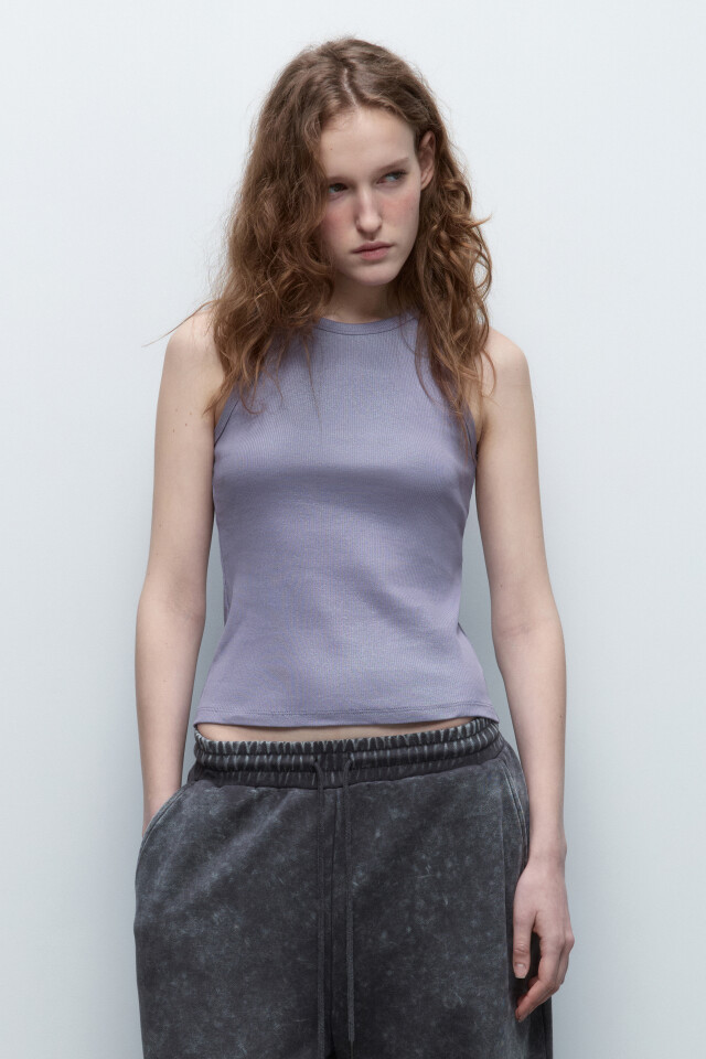 Еще один популярный крой — майки в рубчик. Они красиво облегают фигуру, а за счет необычной фактуры выглядят самодостаточно. Такие модели можно использовать и как нижний слой (например, под бомбер), и как самостоятельный верх — в обоих случаях ты будешь выглядеть стильно. Укороченные майки в рубчик — это отличный выбор для занятий спортом: они не стесняют движения и хорошо тянутся за счет эластичной ткани.