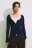 - V-образный вырез кардигана. Имитация майки с широким круглым вырезом и широкой бретелью на шее. Длинные облегающие рукава с прямыми манжетами и спущенной линией плеча. Застежка на пуговицы по всей длине спереди