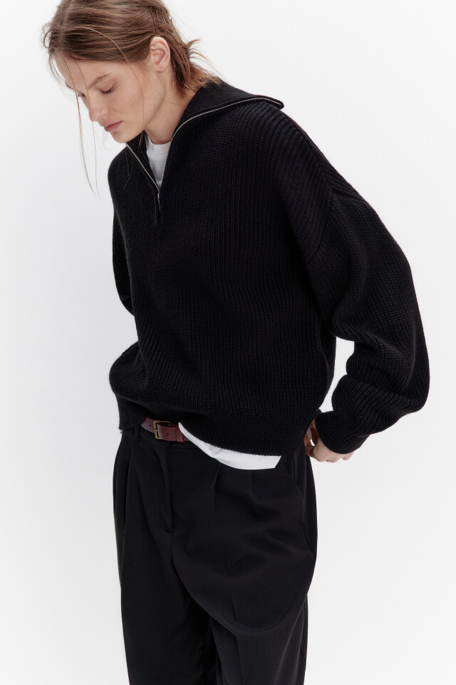 Тем, кто ценит практичность и удобство, понравится свитер с молнией на вороте. Такая модель подойдет и для повседневных образов, и для аутфитов в стиле спорт-шик. Помимо прочего, этот фасон удобно надевать на уже готовую укладку: теперь волосы точно не помнутся!