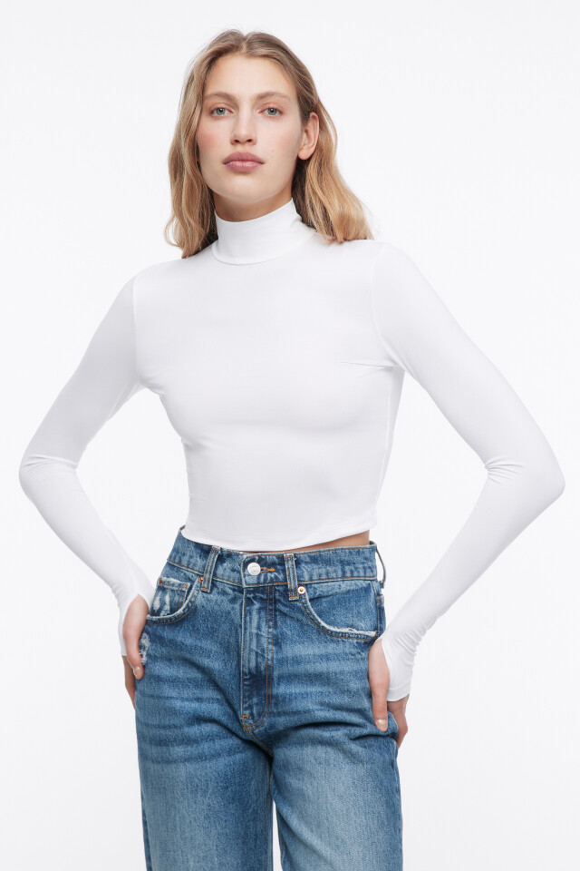 Водолазка незаменима в холодное время года — ее можно сочетать с пиджаком и брюками для более деловых образов или с кардиганом и джинсами для максимально уютных аутфитов. Но водолазка хороша и соло: добавь к ней яркие аксессуары, например, крупные серьги или массивный браслет прямо на рукав — твой стиль заиграет новыми красками. А если хочешь создать в образе изюминку — обрати внимание на укороченные модели.