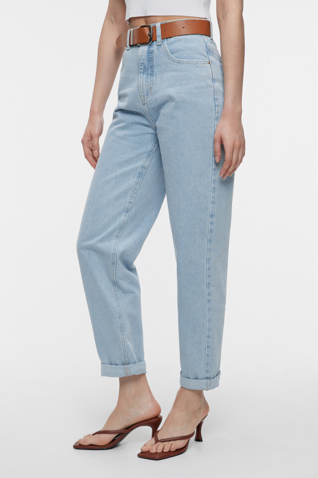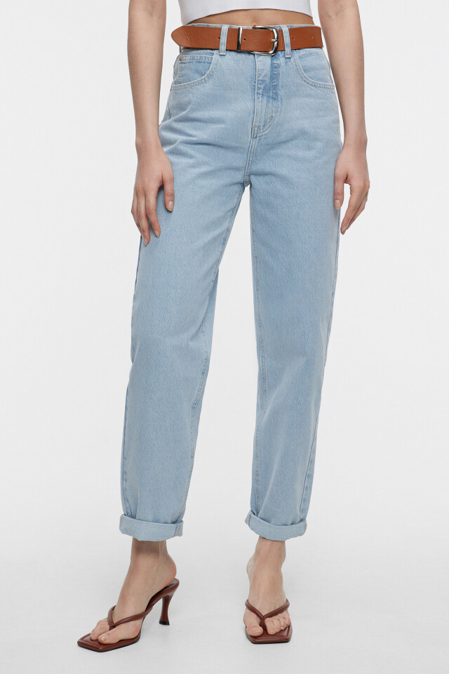 Джинсы-бананы широкие с подворотами и ремнем из искусственной кожи
