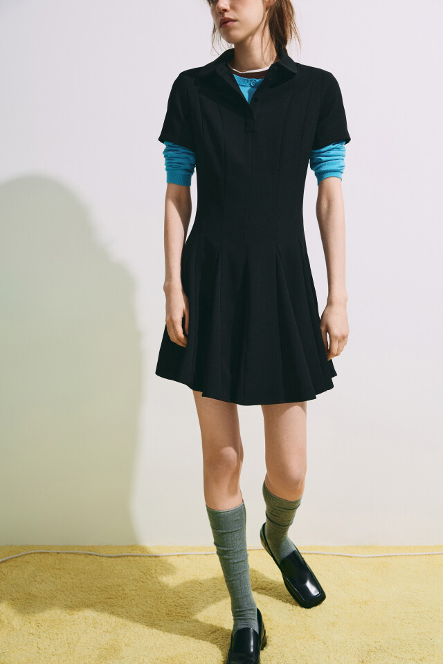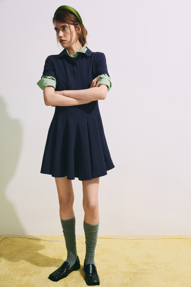 Платье мини в складку с округлым воротником