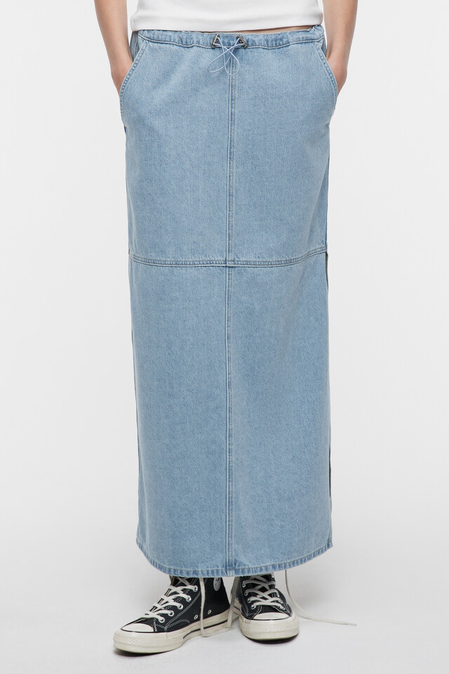 Юбка-парашют джинсовая с утяжками на поясе и разрезом