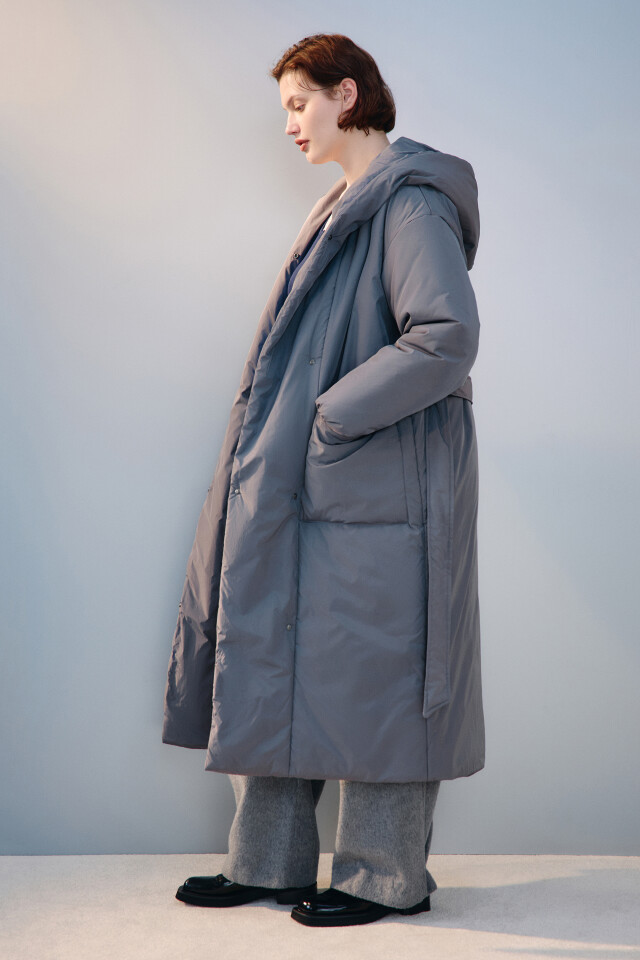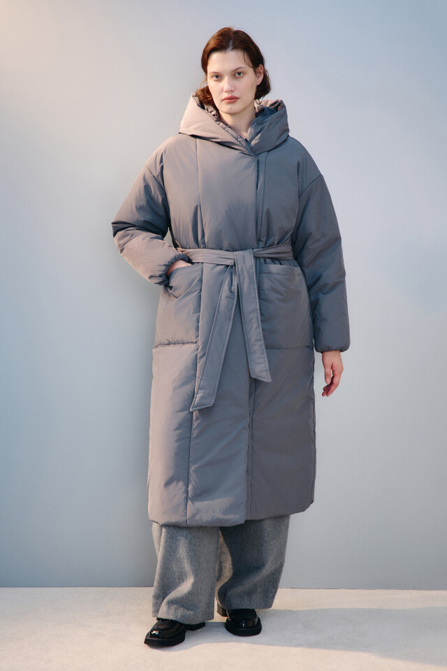 Пальто длинное стеганое с капюшоном